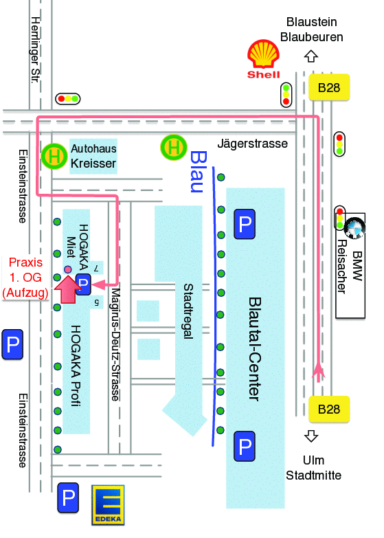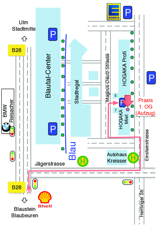 Wenn Sie mit dem Auto aus Richtung der Ulmer Stadtmitte kommen, fahren Sie am einfachsten auf der B28 in Richtung Blaustein-Blaubeuren.